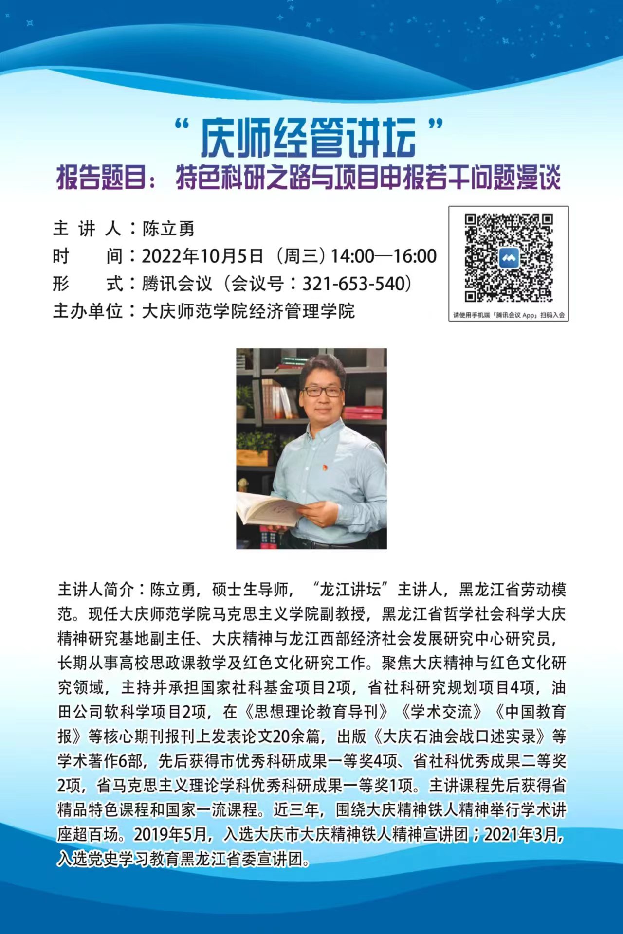 10月5日下午,黑龙江省哲学社会科学大庆精神研究基地副主任、大庆精神与龙江西部经济社会发展研究中心研究员、伟德国际1946马克思主义公司陈立勇副教授受邀做了题为《特色科研之路与项目申报若干问题漫谈》的专题讲座。讲座采用线上腾讯会议形式,由伟德国际1946行政负责人刘楠教授主持,部分文科公司经理、科研副经理、教师以及经管公司全体教师等100余人参会。