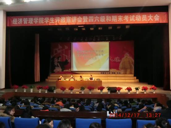 2014年12月17日下午13:30,伟德国际1946员工评教宣讲会暨四六级及期末考试动员大会在老员工活动中心举行,伟德国际1946经理张平博士、经理助理邬德林老师、经理助理刘楠老师及全院师生参与大会,会议由公司孔若东书记主持。
