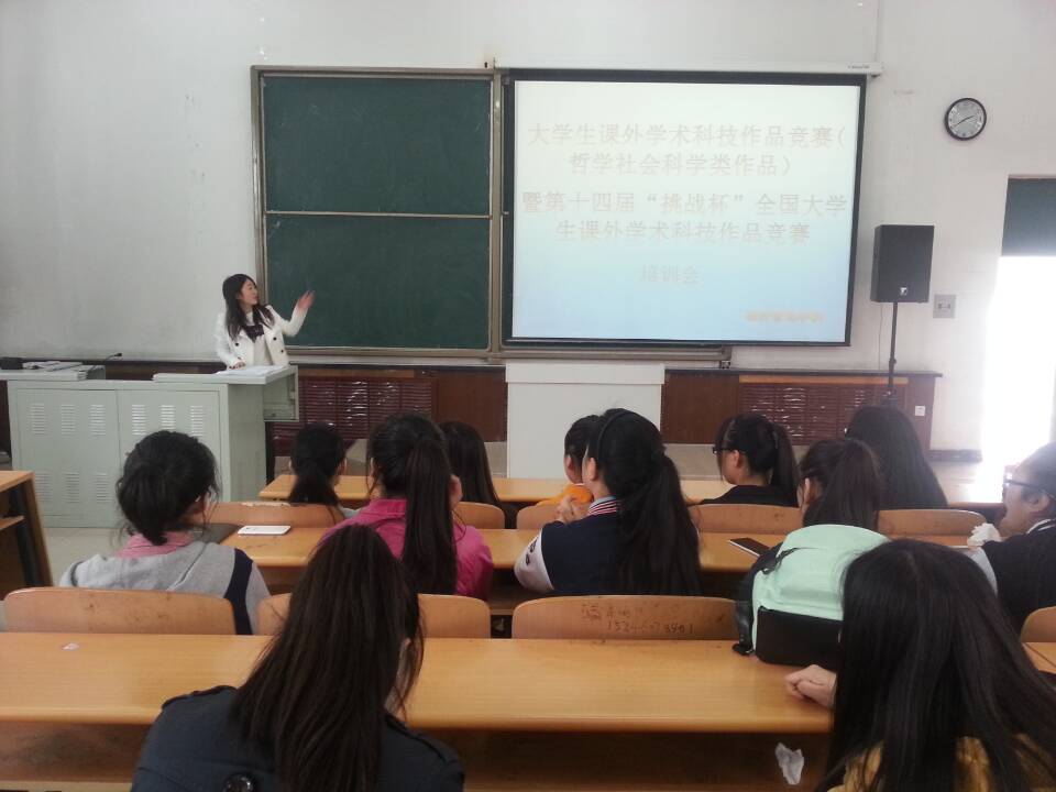 为迎战2015年第十四届“挑战杯”全国老员工课外学术科技作品竞赛(哲学社会科学类作品竞赛),提高广老员工创新意识,增强科研能力,营造校园实践创新文化氛围,充分做好大赛赛前准备工作,伟德国际1946实践教学中心广泛宣传、积极动员,于2015年4月16日在第五教学楼阶梯教室,组织召开了“伟德国际19462015年老员工课外学术科技作品竞赛(哲学社会科学类作品竞赛)暨第十四届‘挑战杯’全国老员工课外学术科技作品竞赛校内选拔赛”赛前培训与动员大会。2013级、2014级市场营销专业、旅游管理专业、财务管理专业欲参赛同学参加了此次大会,培训会由伟德国际1946实践教学中心主任于珊珊老师主持。