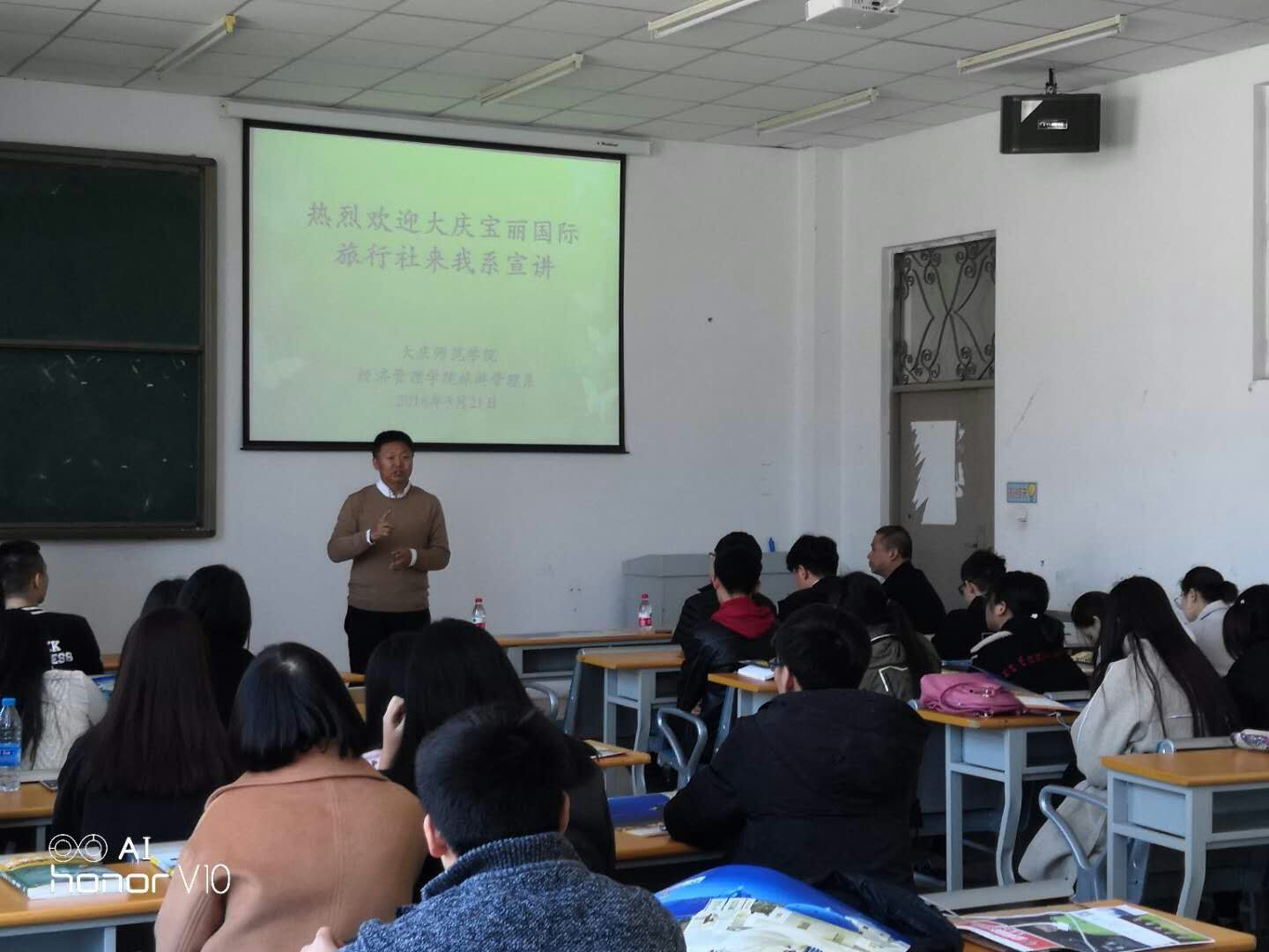 2018年3月21日上午10:00,大庆宝丽国际旅行社总经理王新宇先生一行来公司进行实习宣讲会。