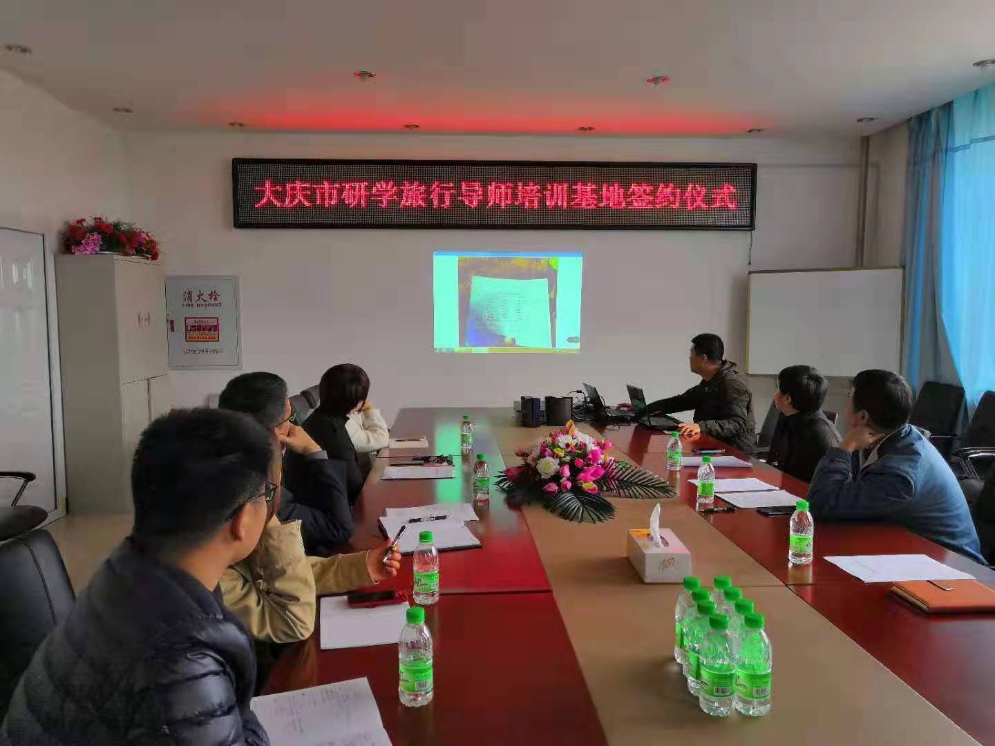 2019年10月28日上午9点,“大庆市串联行知研学指导教师培训基地”签约授牌仪式在公司会议室举行,刘楠经理、行知研学教育公司郭总、研学导师张孟楠、大庆广电旅行社初总参加签约仪式。仪式由旅游管理系主任车鑫主持,旅游管理系骨干教师参与讨论。