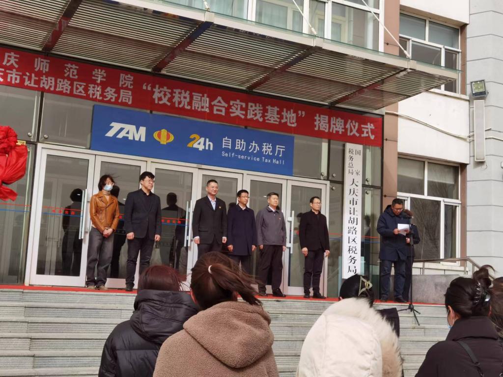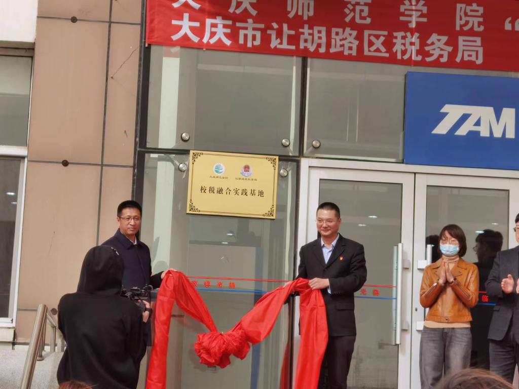 3月22日伟德国际1946与大庆市让胡路区税务局共同成立的“校税融合实践基地”揭牌仪式在让胡路区税务局隆重举行,让胡路区税务局韩国学局长、张赫副局长及工作人员,伟德国际1946副董事长张平、经管公司经理刘楠、副经理李媛媛以及部分财务管理专业的师生参加了揭牌仪式。基地的成立将使经管公司与让胡路区税务局的联系更加紧密,合作更加深入,尤其是对于财务管理专业员工实践能力的培养将发挥重要作用。