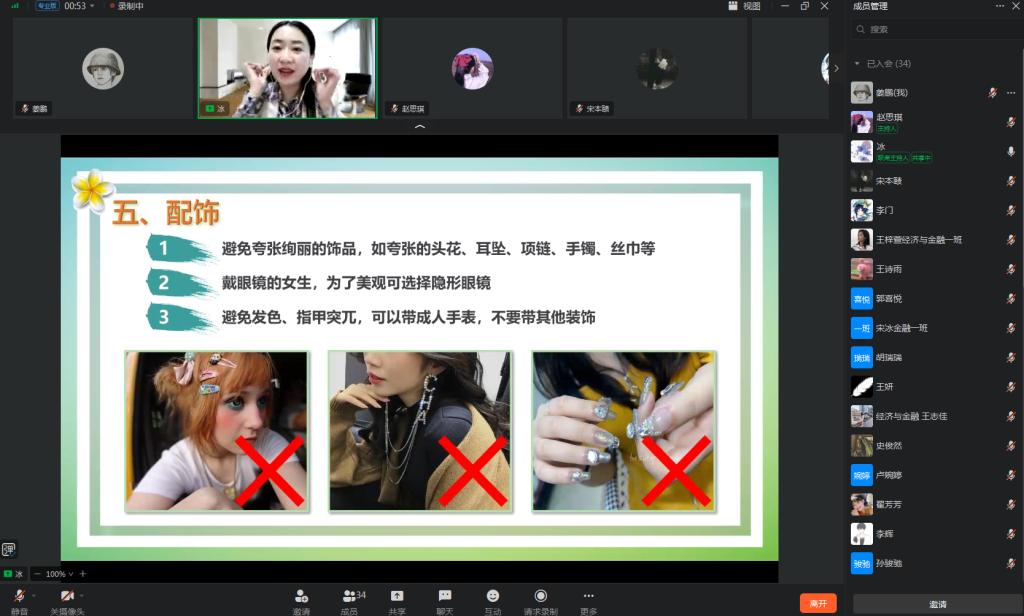 王冰老师以专业的形象礼仪知识和丰富的职场经验,为同学们奉献了一场精彩的讲座,使同学们更加熟悉职场面试时应该注意的形象与礼仪方面的细节。根据教学安排,“银行证券班”将按照课程体系继续安排后续课程上线。