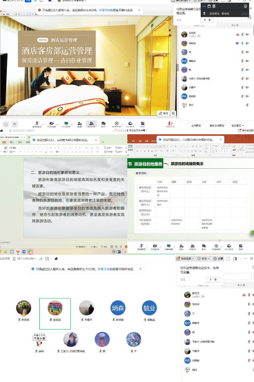 为全面提升课堂教学质量,本次集体磨课活动以“以评促建、以评促改、以评促强”为目标,覆盖了6门旅游管理专业核心课程及5门选修课程,采用“线上+线下”双模式开展集体磨课,线上磨课依托腾讯会议平台进行,线下磨课则在旅游管理教研室集中开展。教师们依据教学进度表中第10-12周的教学内容,按照说课、教学展示、集体研讨三个环节进行。